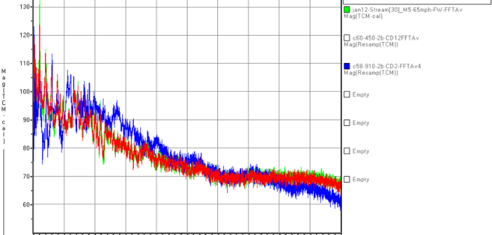 Two SUV mud and snow tires measured on the steel road wheel can exhibit significant differences (see Figure 14). The spectrum for the C60 tire (cyan) is 7dB lower than the C58 (blue) tire but with a similar spectral shape. N.B. Neither rolling road PCR is above 115dBLin while the road PCRs are >123dBLin.