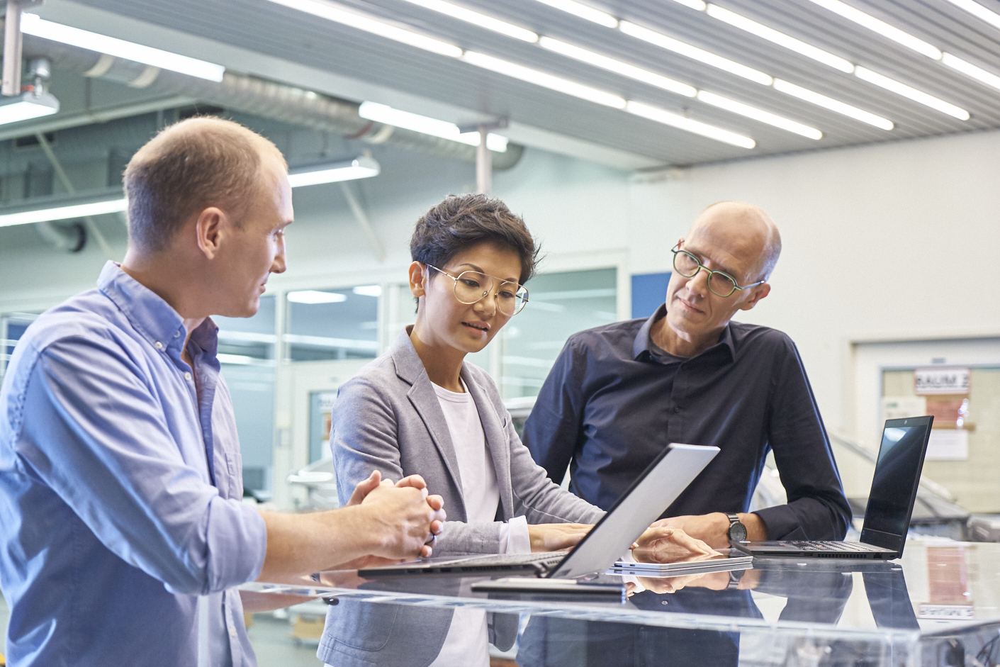 ASAM staff talk in front of a vehicle being constructed in a stark indoor testing laboratory environment